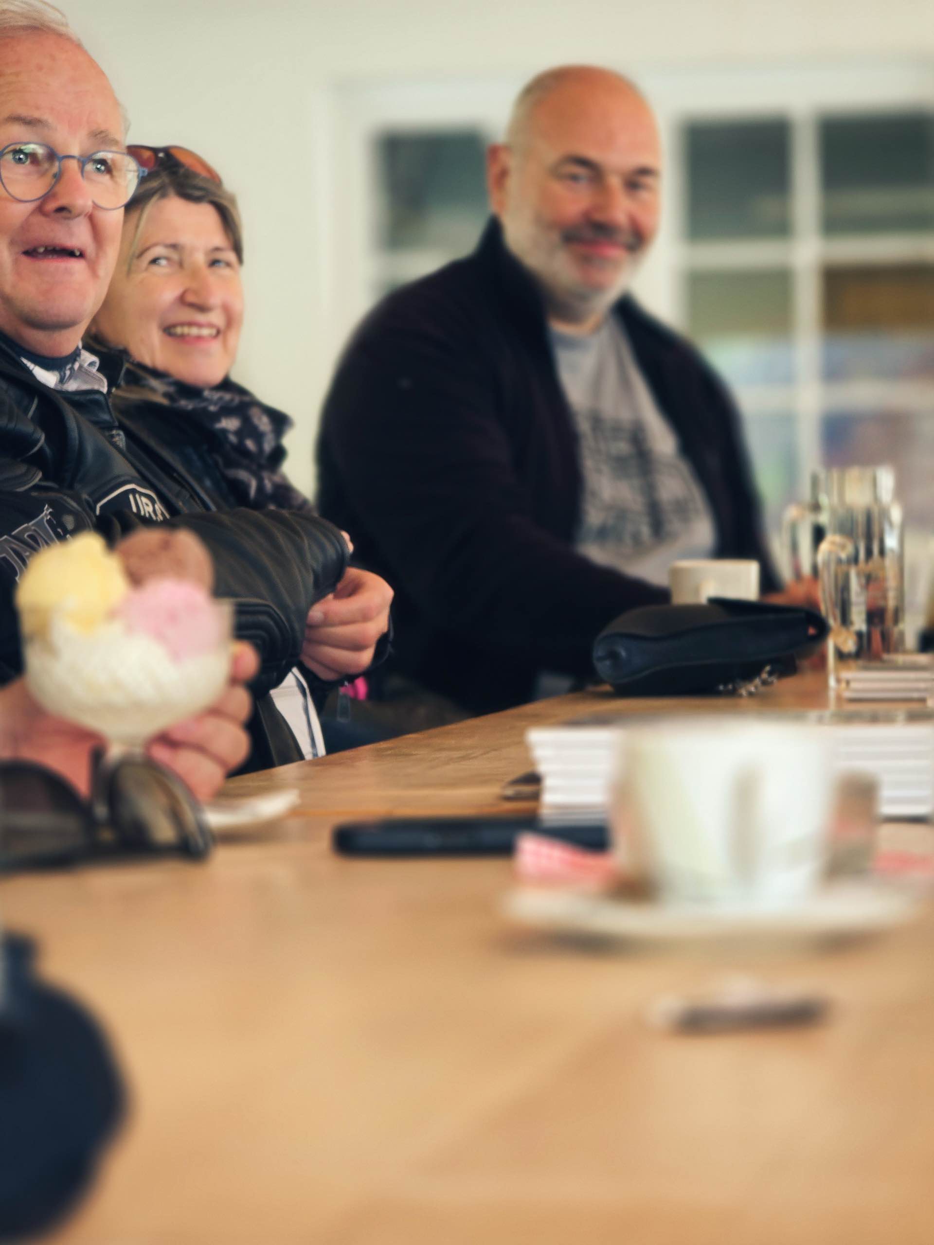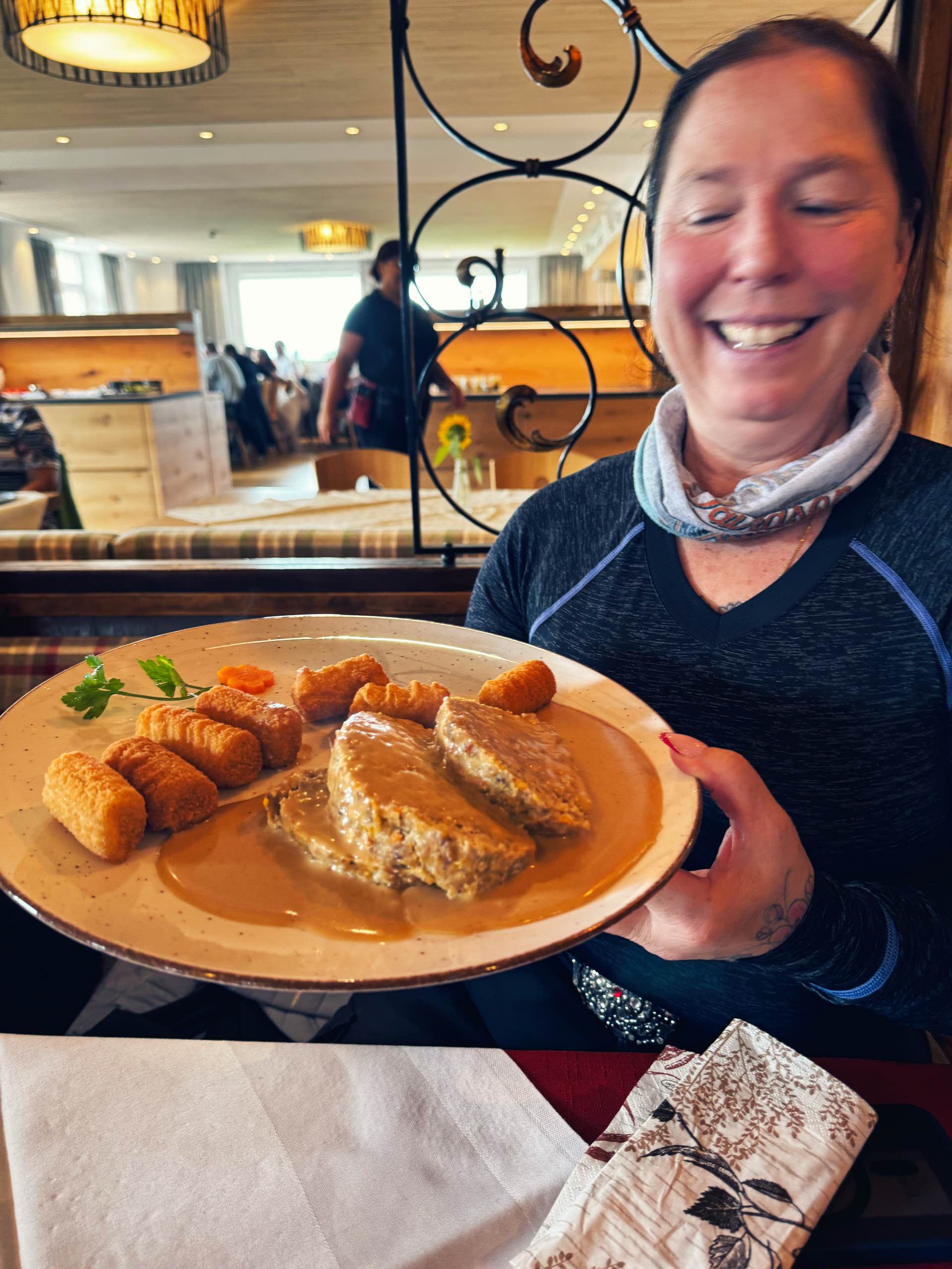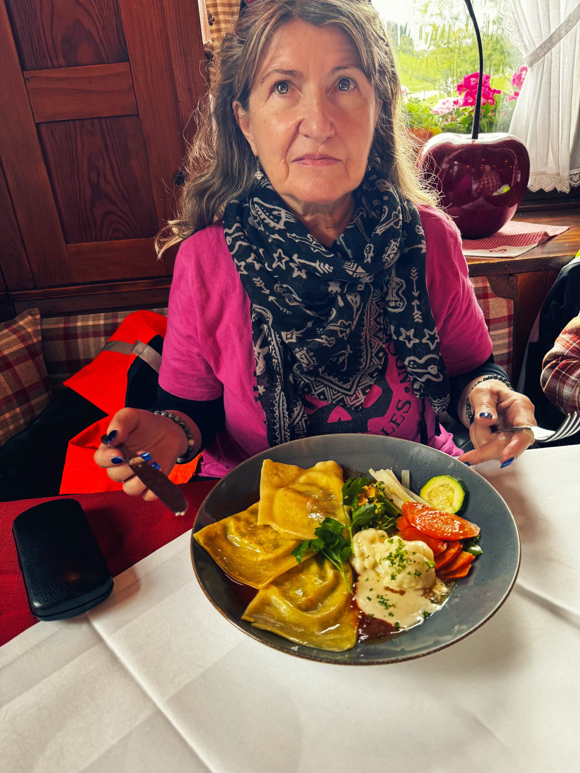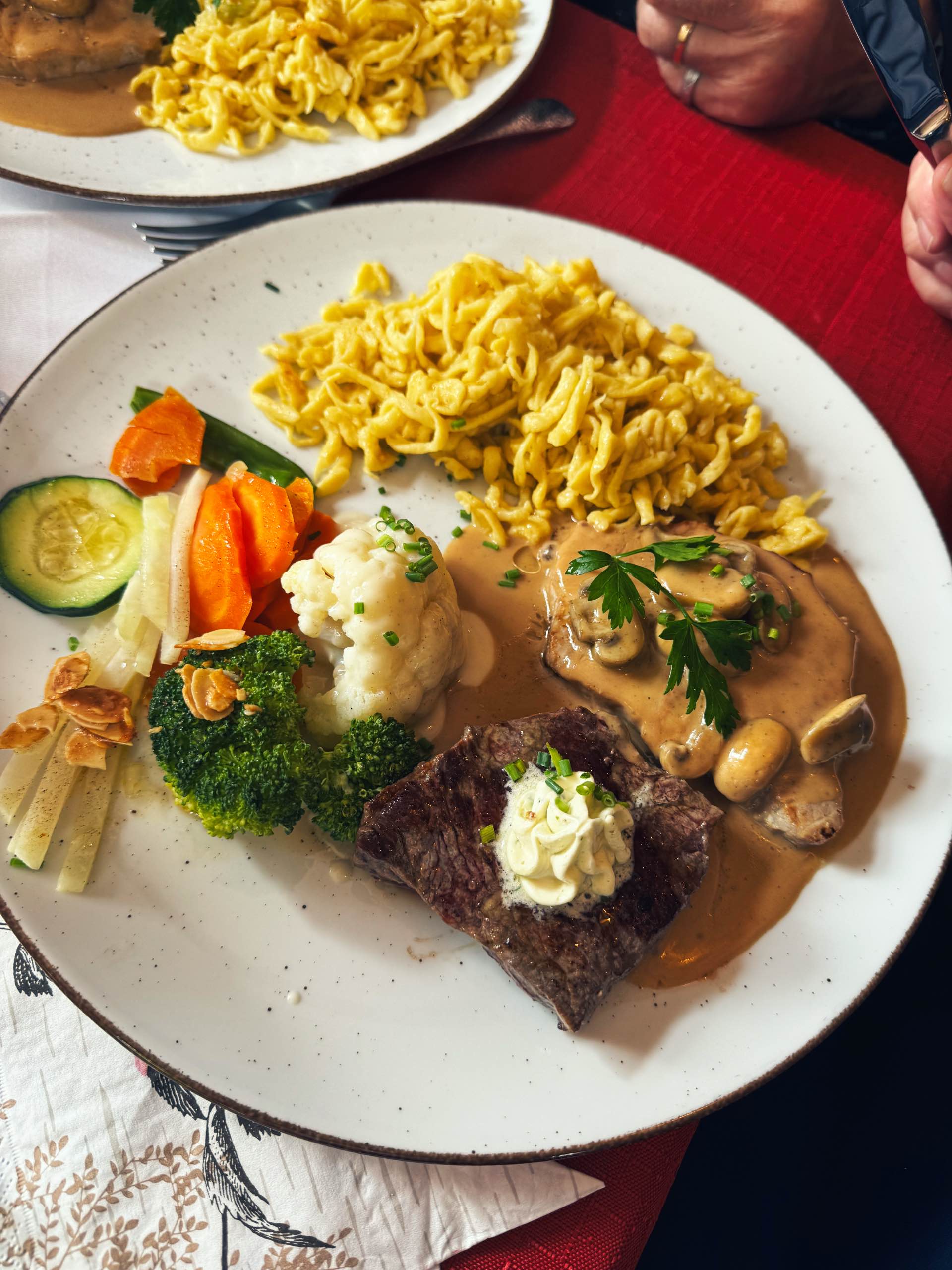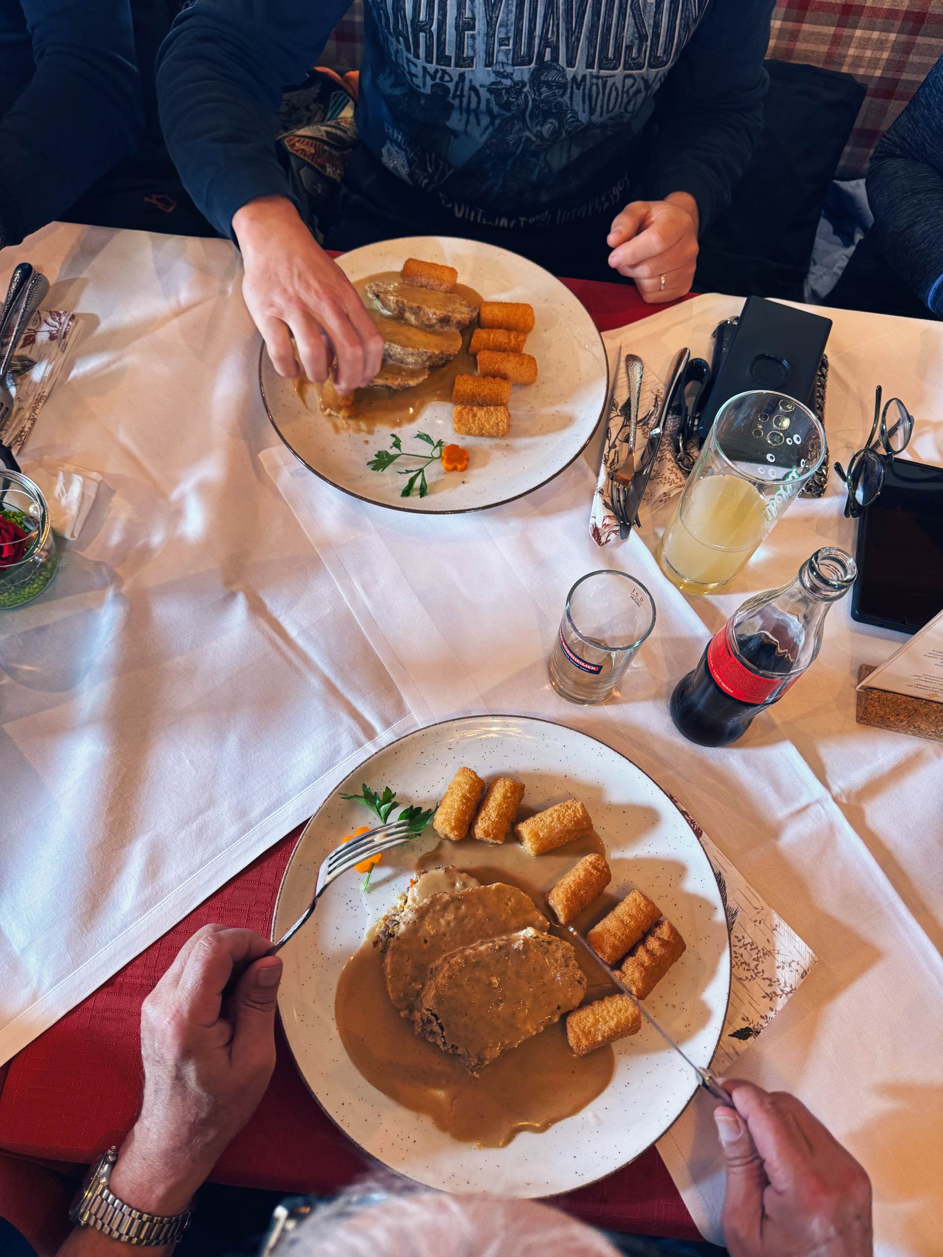 Das Mittagessen war bestens. Zum Glück hatte Oli die Bestellliste dabei – erstaunlich, wie schnell man vergessen kann, ob man nun Kutschenteller, Maultaschen oder Hackbraten bestellt hatte. Nach der Stärkung wartete die grosse Überraschung: Der Regen hörte tatsächlich auf. Wir warfen die nassen Schichten von uns wie Schlangen ihre alte Haut und machten uns erleichtert wieder auf den Weg.
