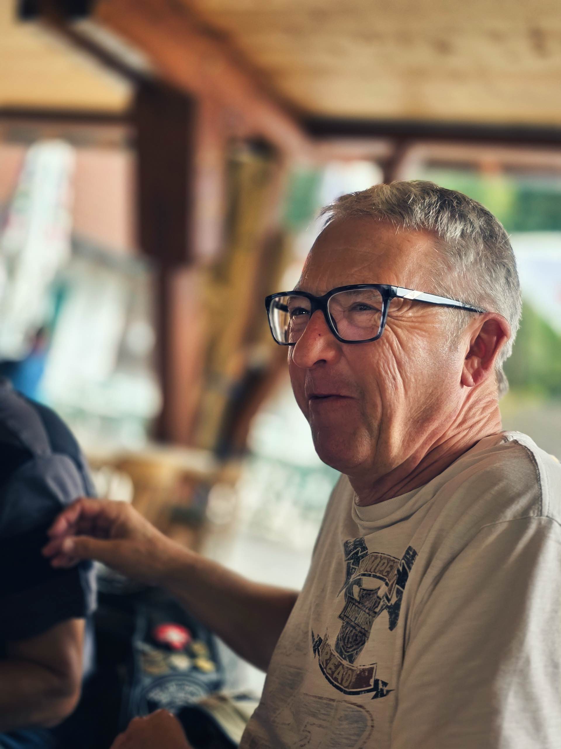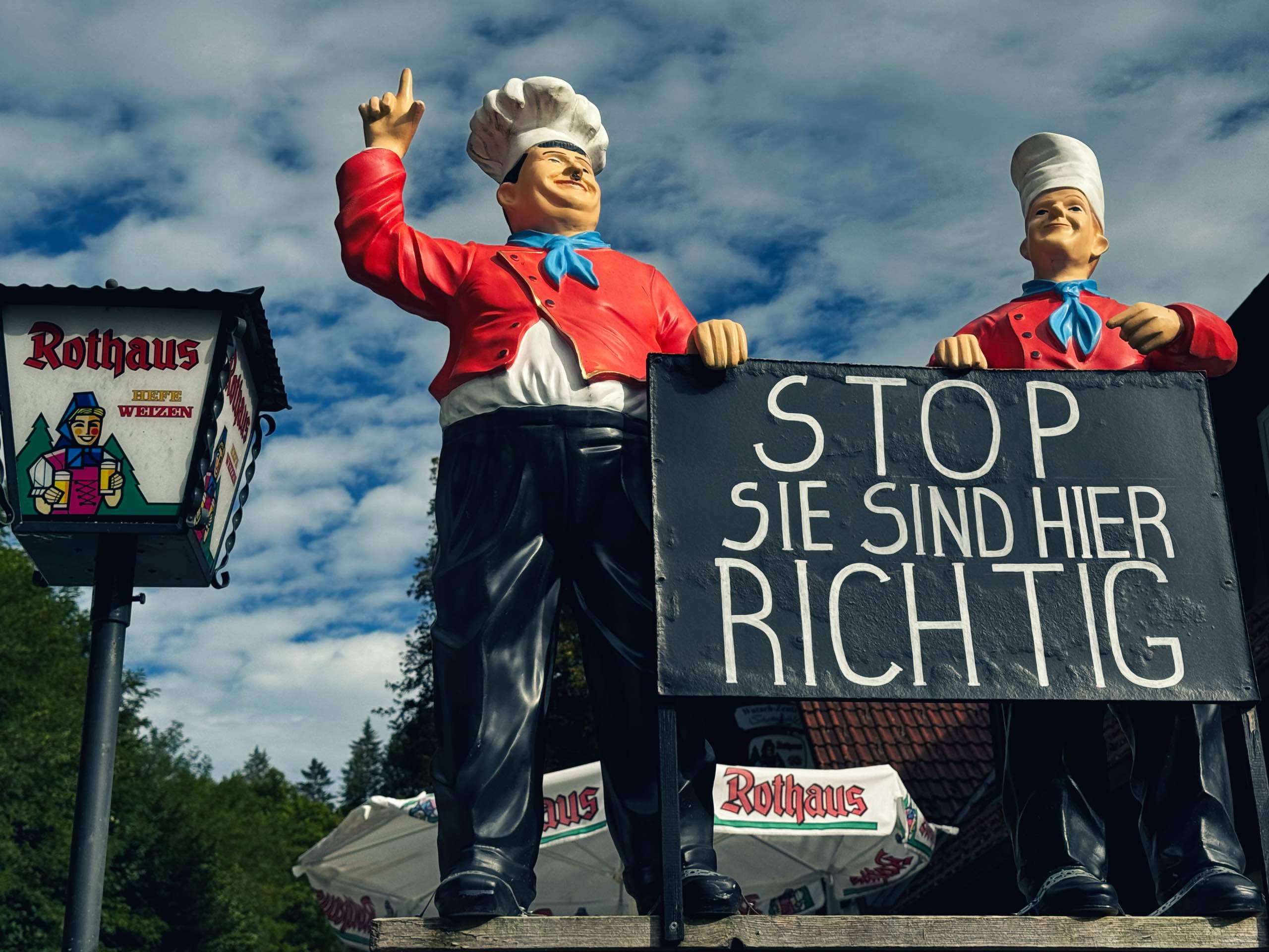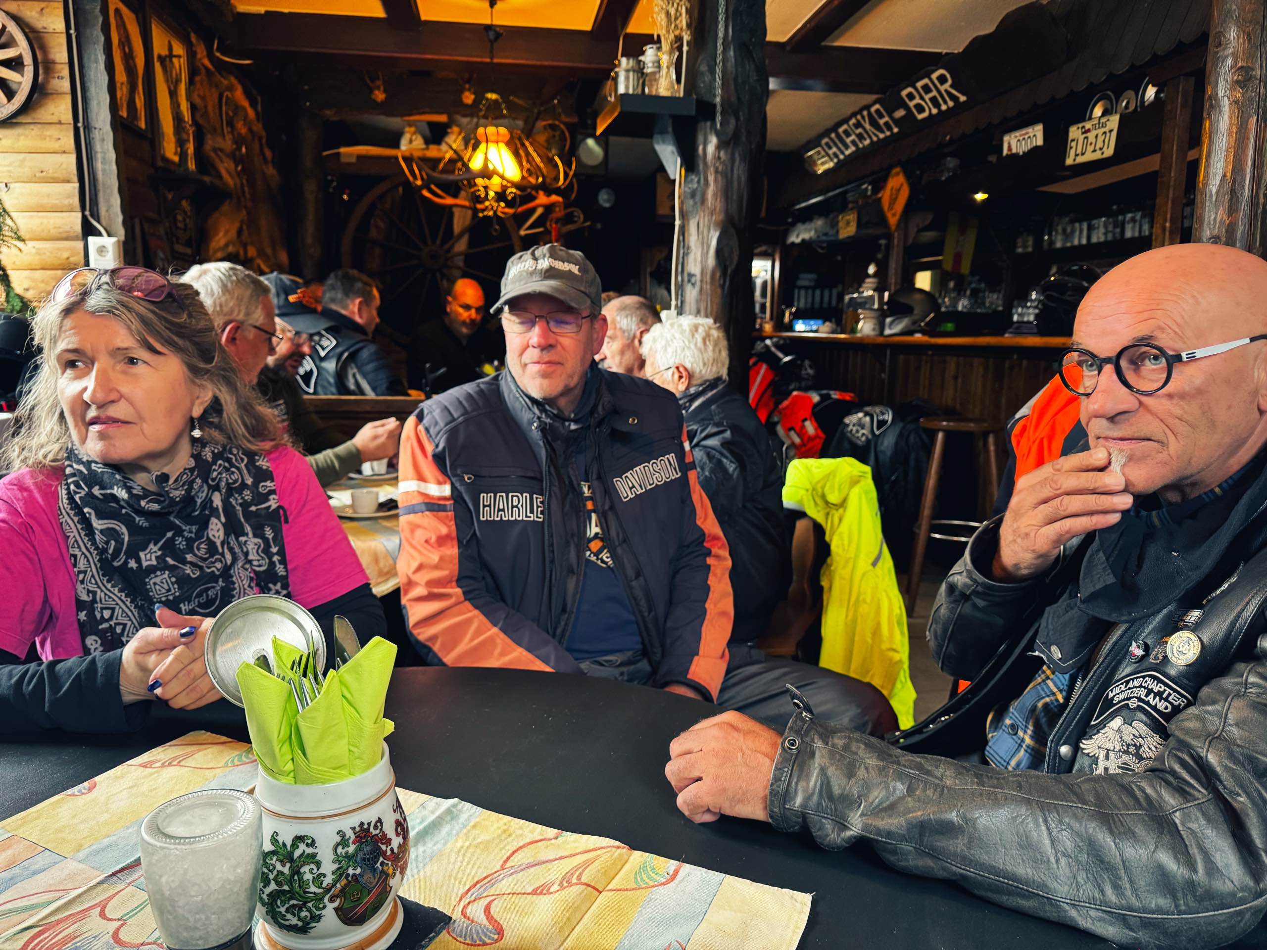 Trotz Regen schlängelten wir uns tapfer durchs Wehratal. Nach rund 70 Kilometern war der Kaffeestopp im Restaurant Waldhaus bei Todtmoos mehr als verdient. Drinnen fühlte man sich wie in Alaska: Holz, Indianerfiguren, Geweihe an der Wand – fehlte nur noch ein Grizzly, der an der Bar sein Bier bestellte. Eine «Alaska-Bar» lud ein zum Schnaps, aber wir hielten uns streng ans Club-Motto: Wir fahren trocken – zumindest was den Alkohol betrifft. Das Wetter hingegen hielt sich nicht an Abmachungen. Als wir wieder rauskamen, regnete es fröhlich weiter.
