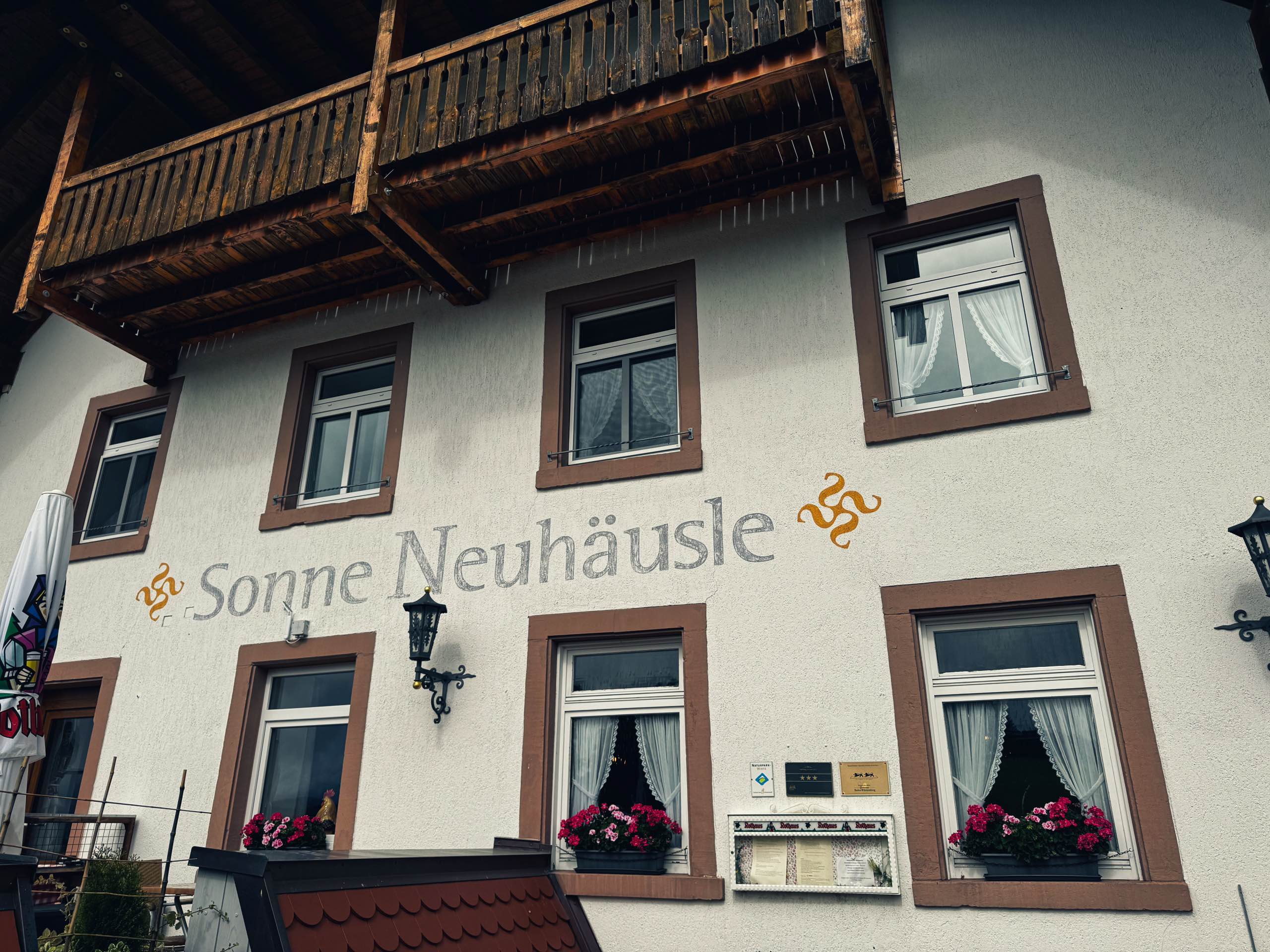 Weiter ging’s durch den Hochschwarzwald. Vorbei an Skiliften, durch Täler, über Hügel – eine Bilderbuchlandschaft, die im Sonnenschein sicher noch schöner wäre. Doch wir gaben nicht auf. Das Ziel: Mittagspause im Gasthaus Sonne Neuhäusle. Mein Tacho zeigte 141,6 Kilometer. Der Parkplatz war gross genug für unsere Harley-Armee, und einige Glückspilze konnten ihre Maschinen sogar unter ein Dach stellen.