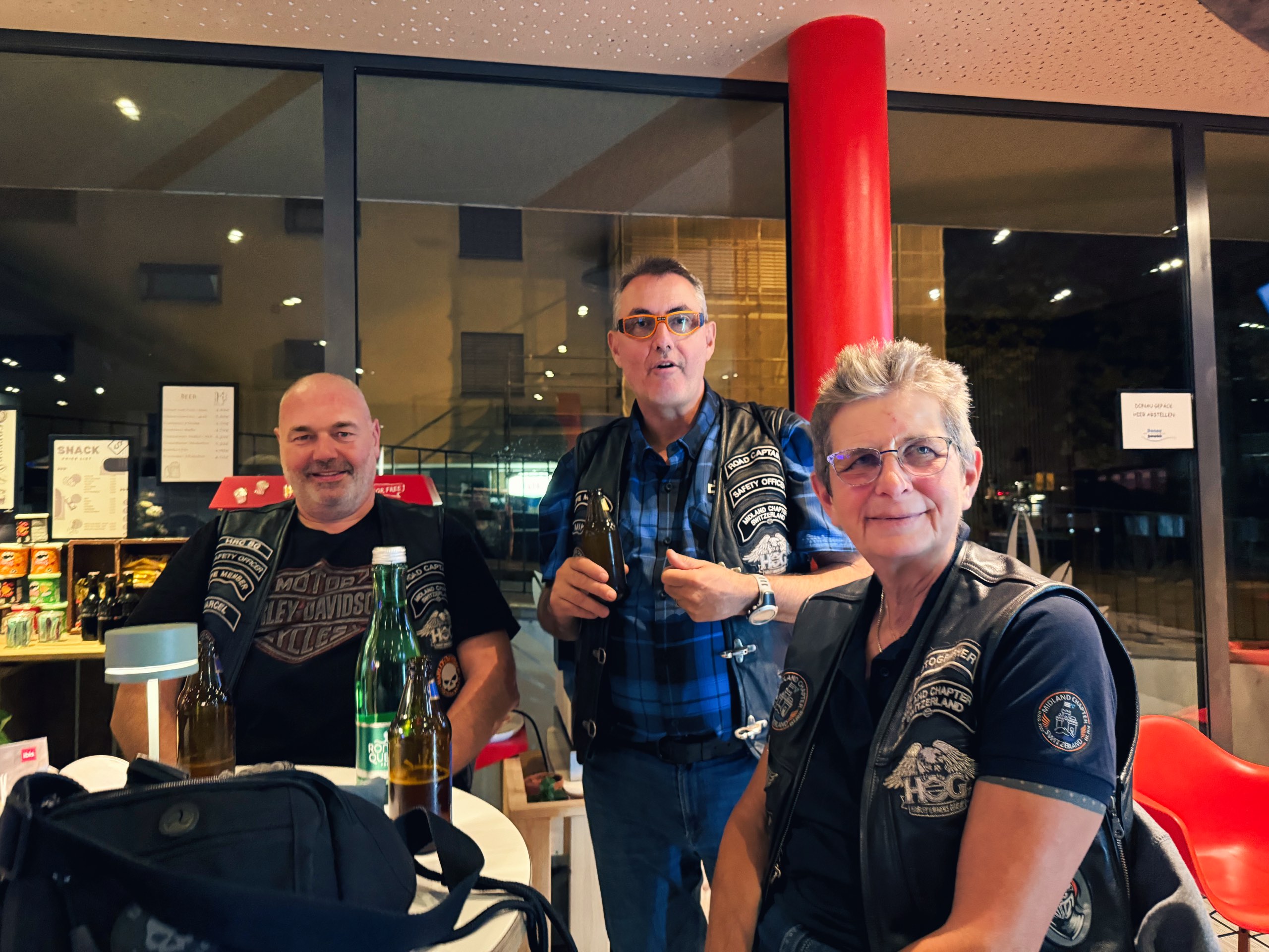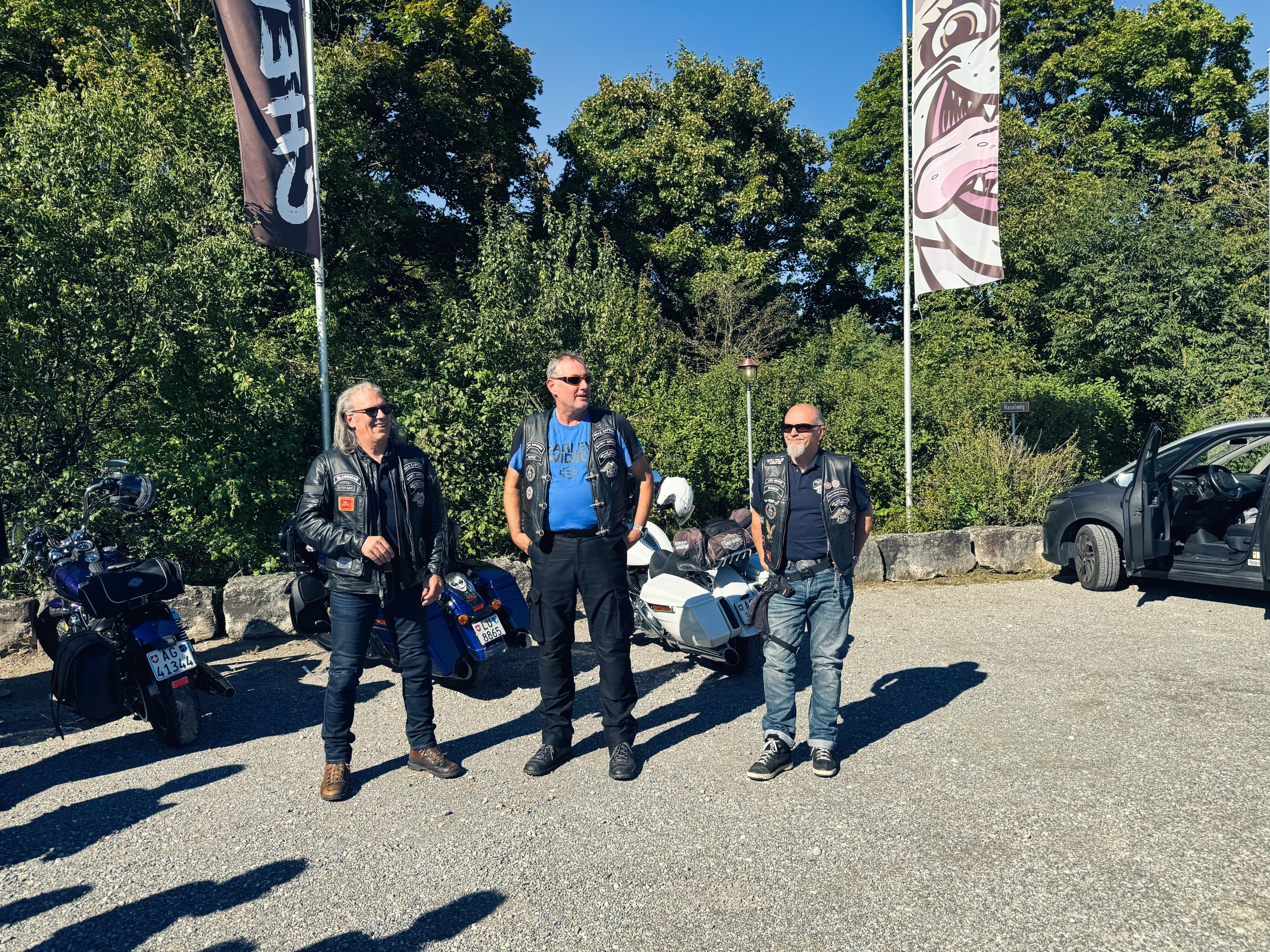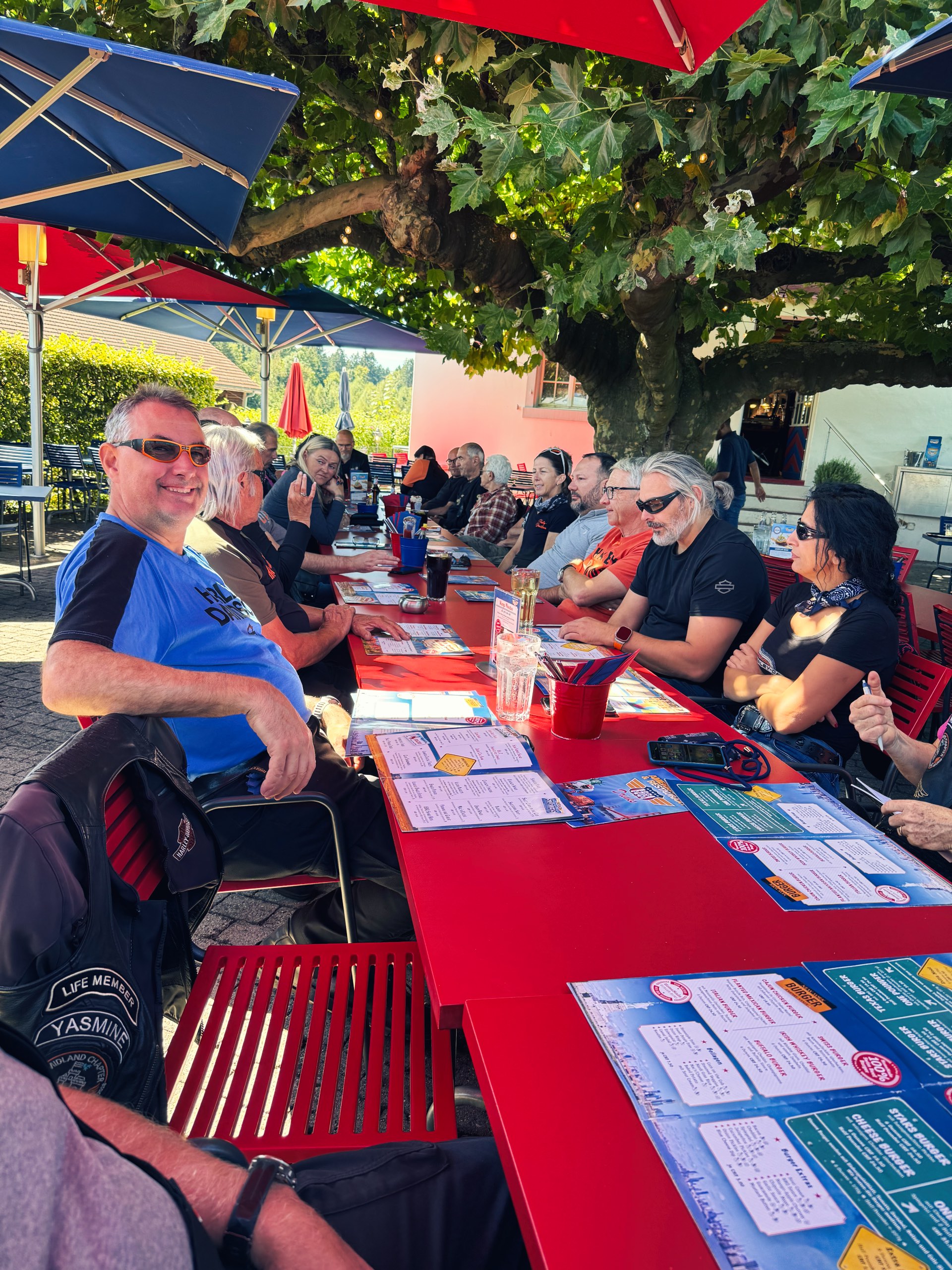 Um etwa 16.20 Uhr erreicht das Chapter schliesslich den Endpunkt in Remigen beim Chevy’s Road Stop. Road Captain Mike ruft uns nochmals zum Schlusswort zusammen. Dies ist erst seine zweite Tour gewesen und die erste zweitägige, welche er organisieren durfte. Er äussert sich total begeistert und freut sich, dass alles so gut geklappt hat und wir alle gesund am Ziel angekommen sind. Fahrstile kann er als Frontmann nicht so gut beurteilen, aber Safety Stefano hat nichts zu bemängeln; aus seiner Sicht war alles okay oder jedenfalls nicht der Rede wert. Auch HRC Roman findet die Tour rundum gelungen und dankt Mike für die Arbeit und Top-Organisation.