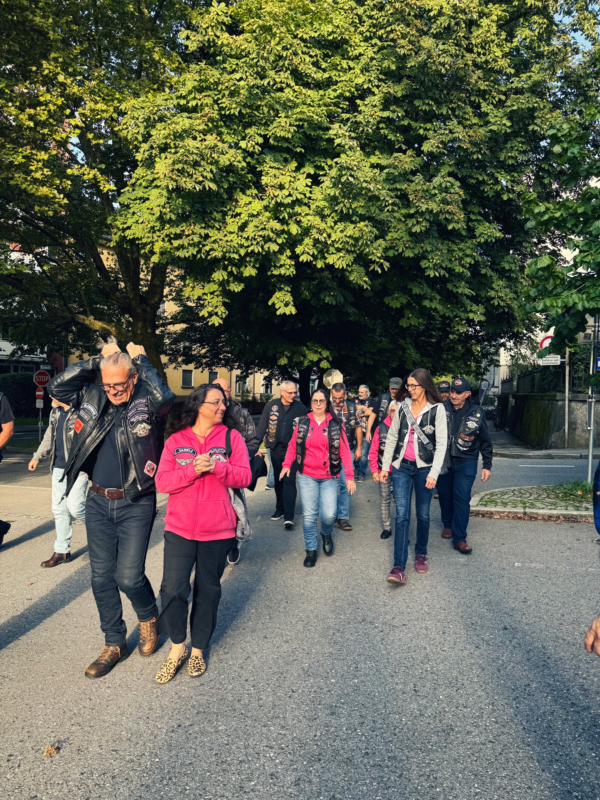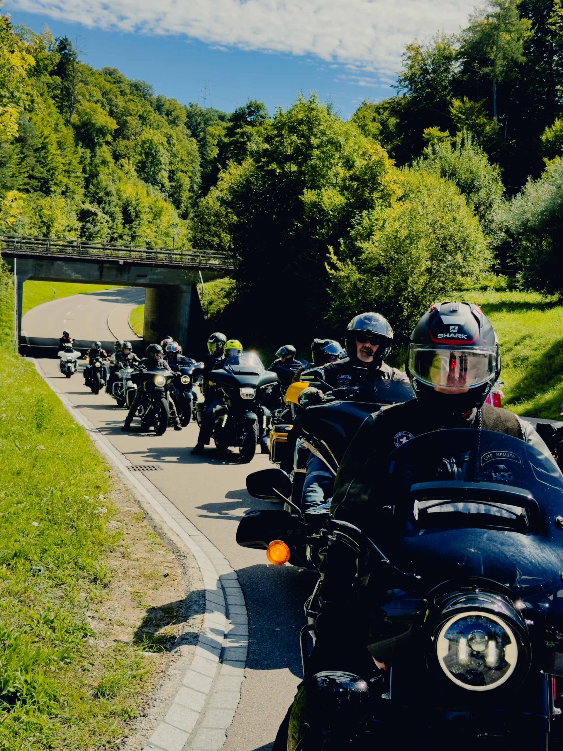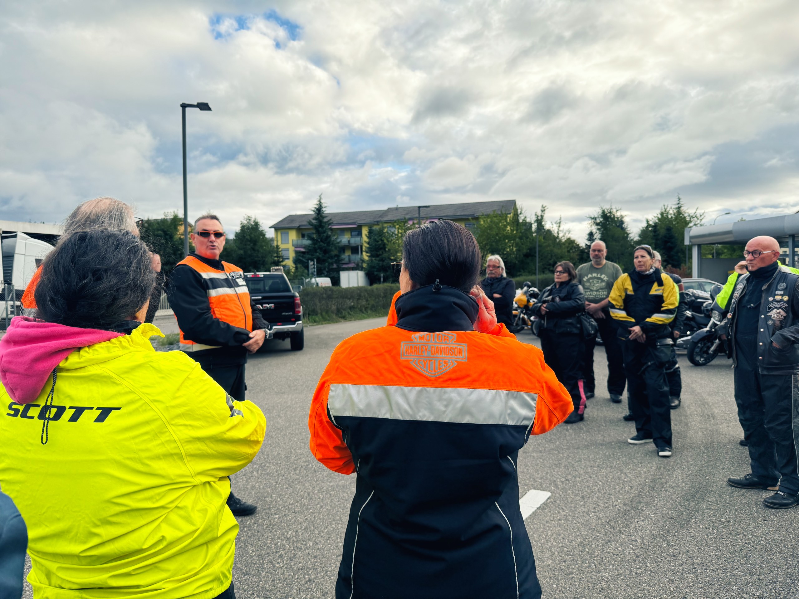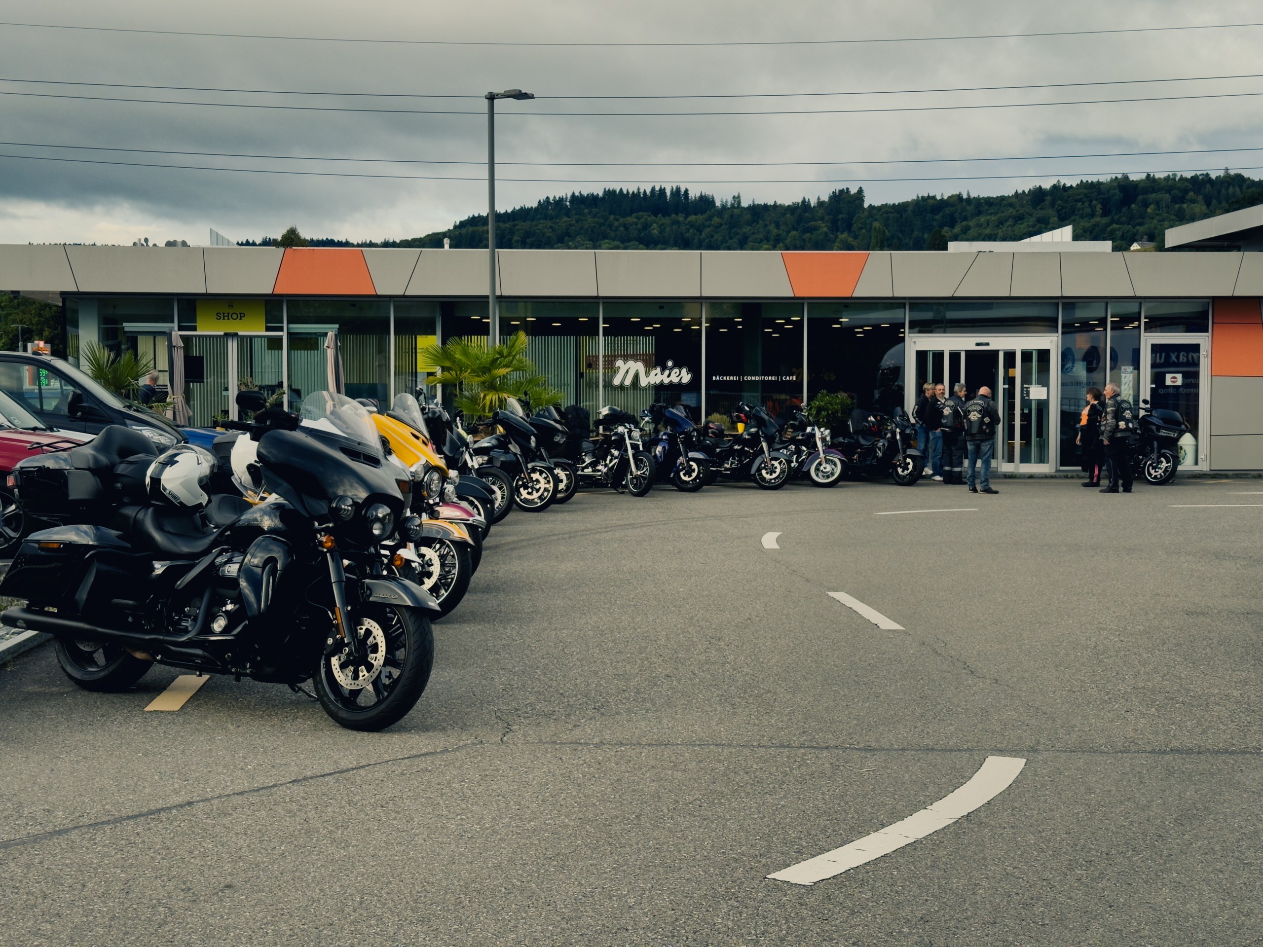 Wir treffen uns am Samstagmorgen, 07.45 Uhr, bei unserem Stamm-Café Maier in Dintikon zum Start der zweitägigen Indian-Summer-Tour. Nach Sommer sieht es zwar vorerst nicht aus, einige sind bei Regen zu Hause losgefahren, aber wir haben ja alle wasserdichte Kleidung, und die paar Tropfen tun der guten Laune keinen Abbruch. Einige der 26 Teilnehmer sind schon früh vor Ort (wie üblich bei den Midlandern), nach und nach trifft auch der Rest ein. Die Vorfreude ist gross, bei bester Stimmung wird Kaffee getrunken und Gebäck gegessen. Unsere Gruppe umfasst 21 Harleys, das heisst, 5 Fahrer reisen mit ihren Sozias. Road Captain Mike Styger ruft uns zum Briefing zusammen und informiert über die ersten ca. 99 km, auch Safety Officer Stefano gibt noch kurze Anweisungen zum Einreihen in den Konvoi, damit die Funkverbindung bis zu ihm gewährleistet ist.