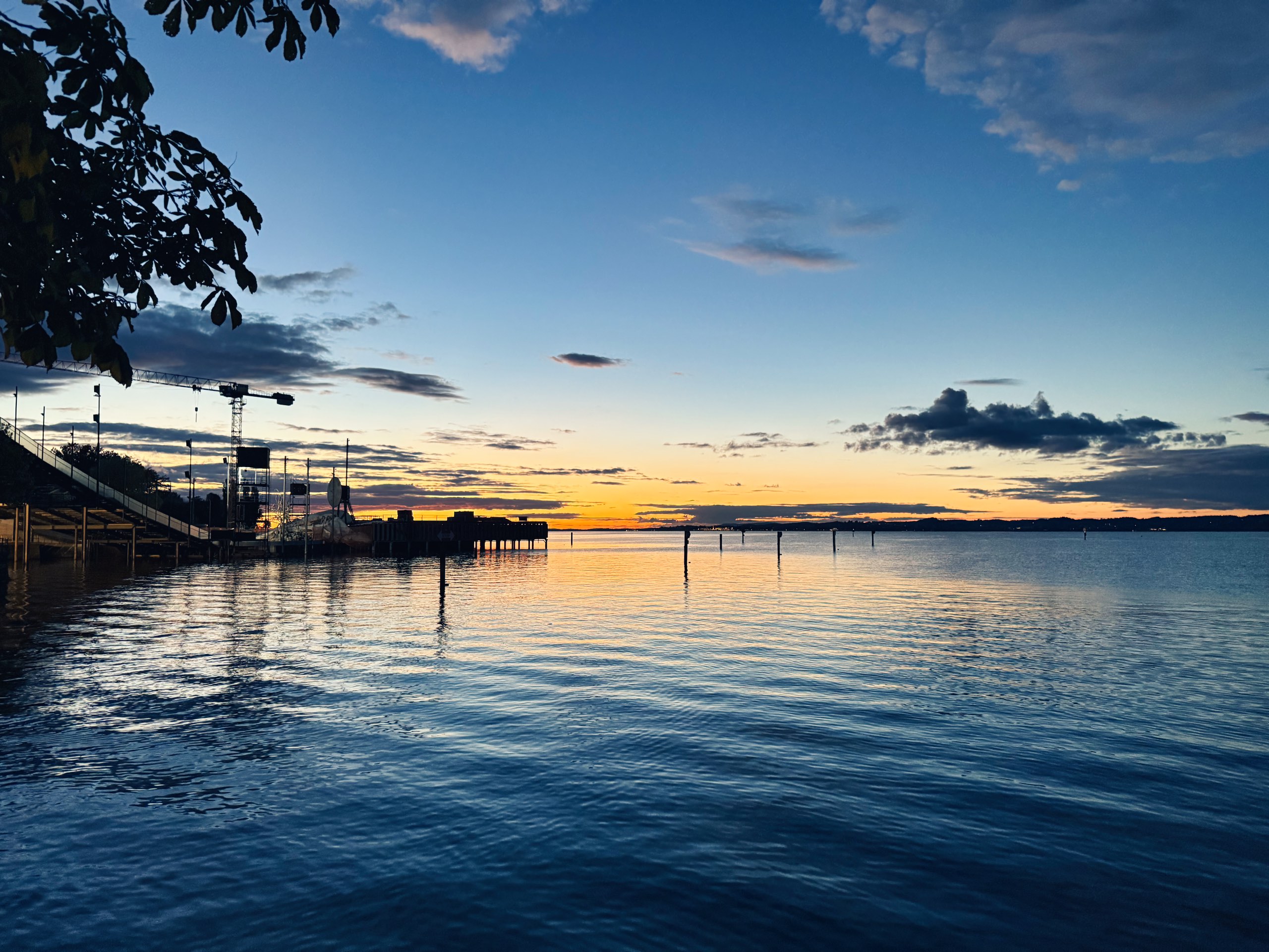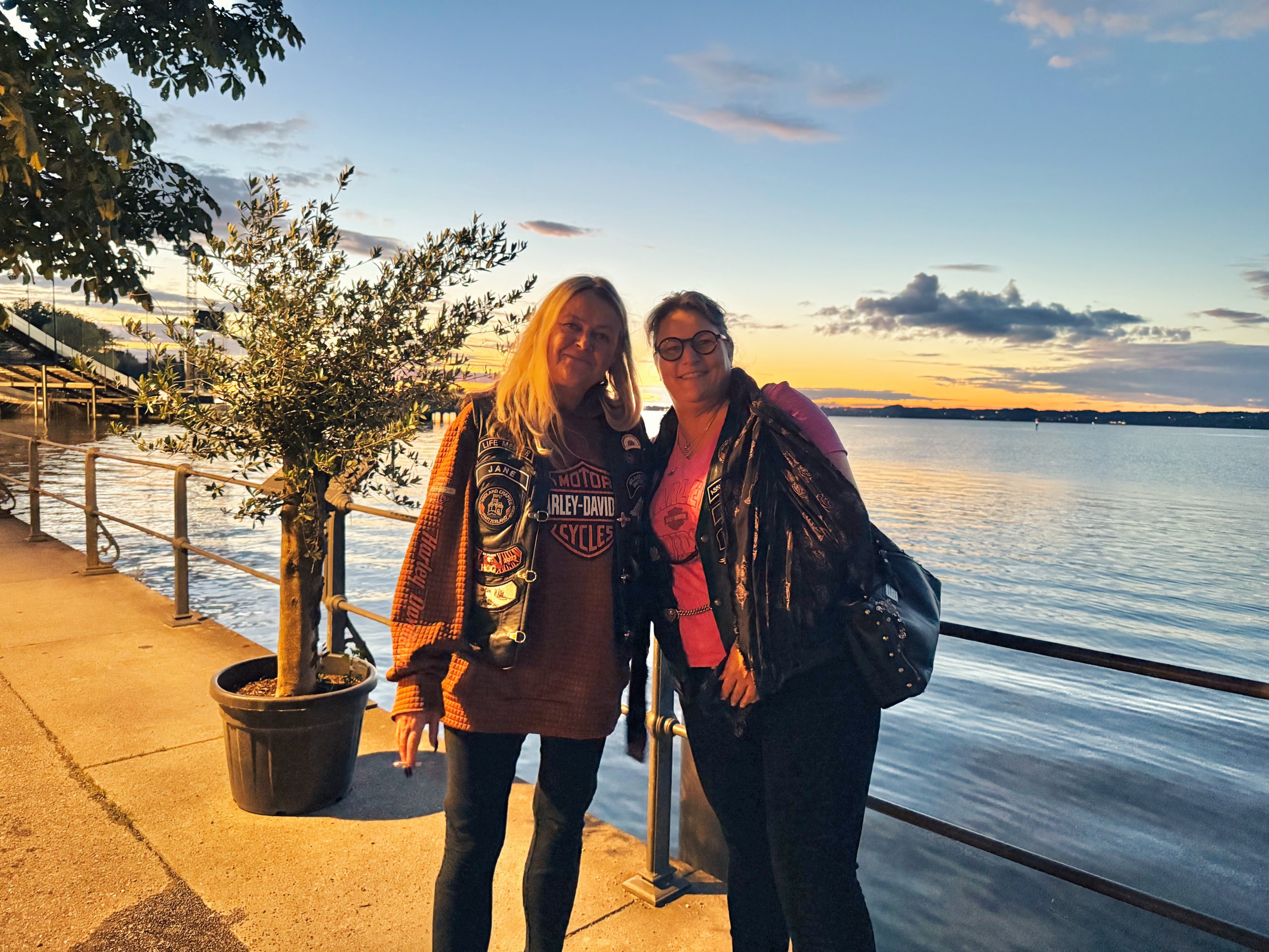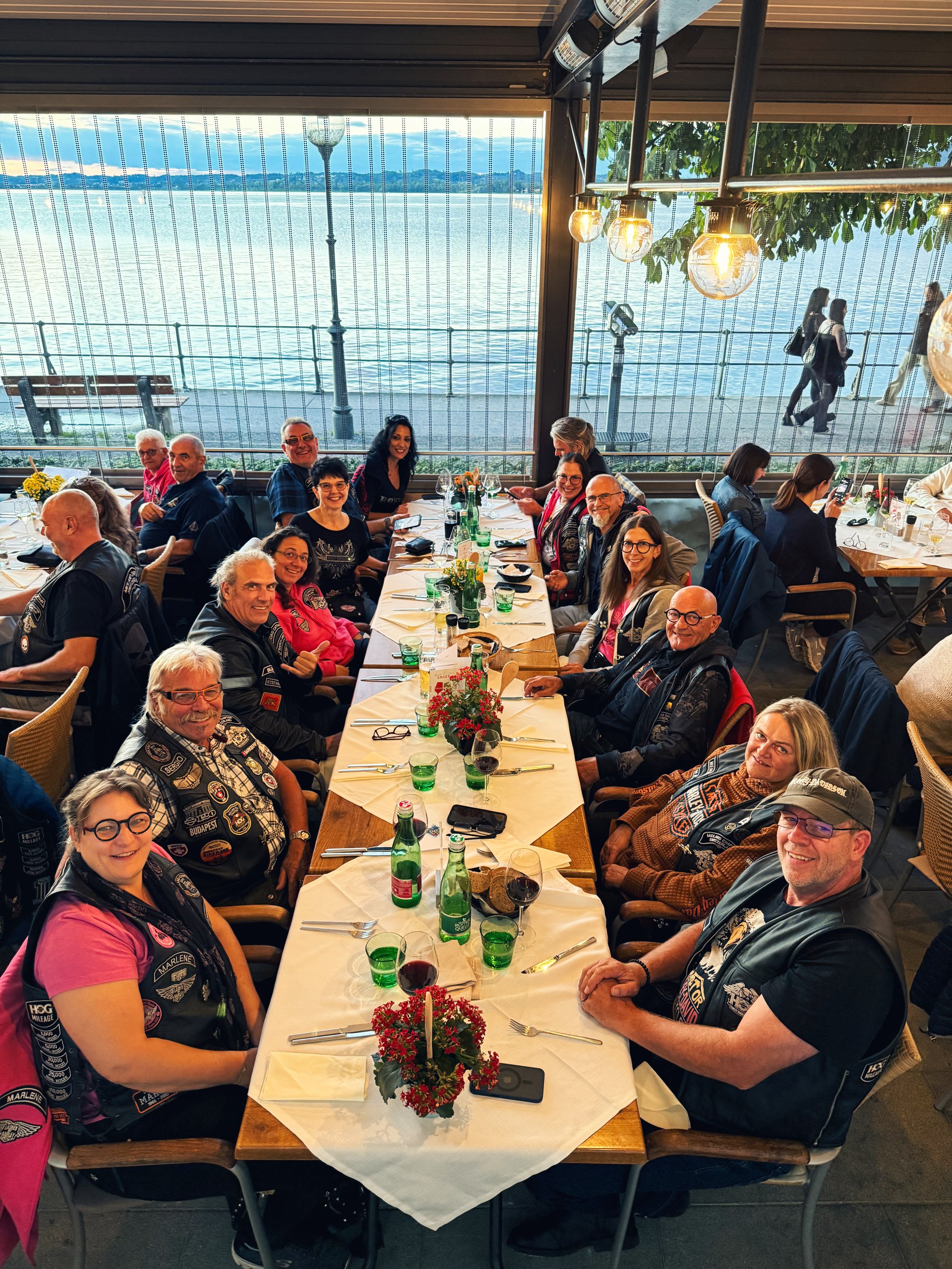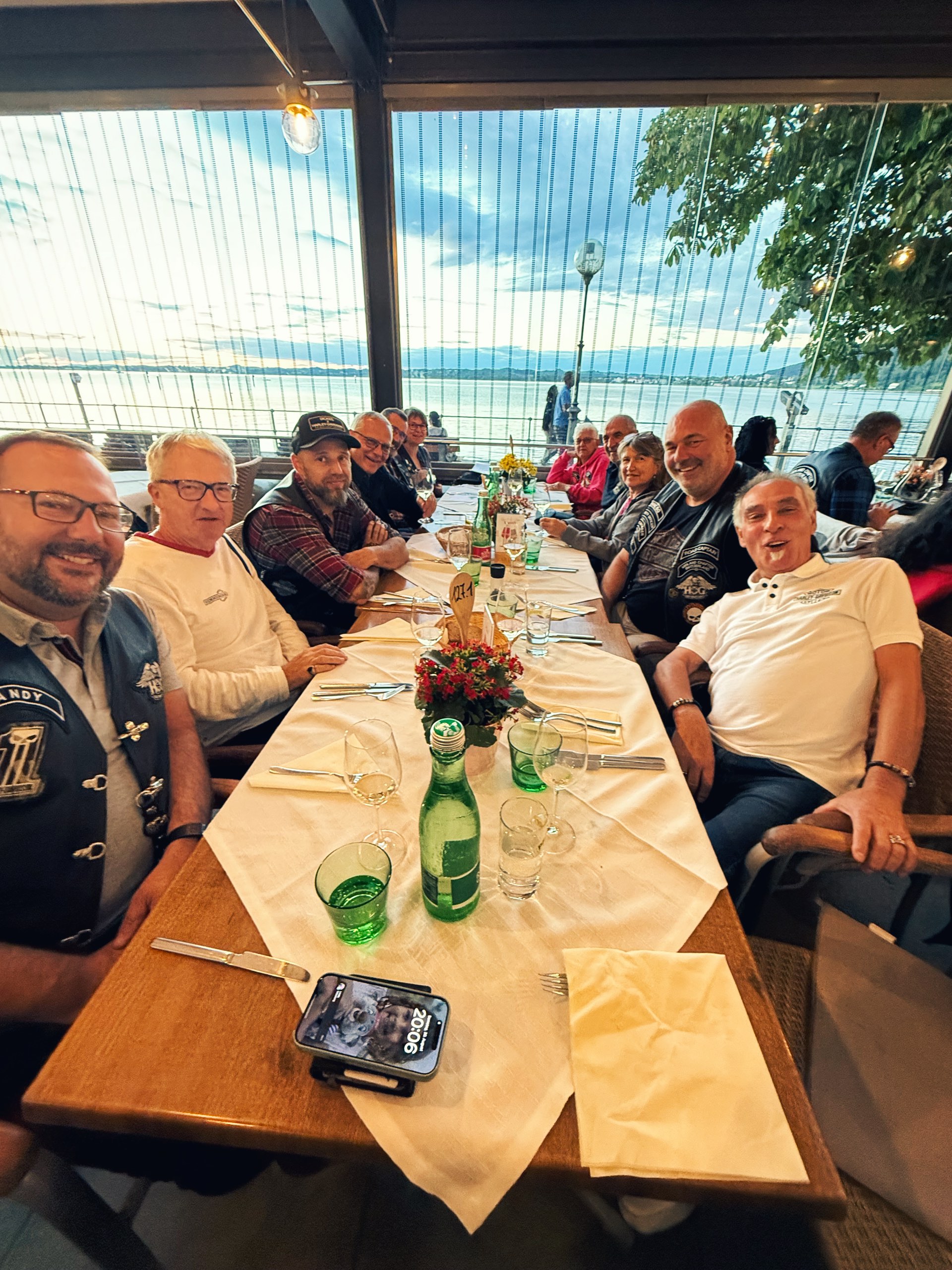 Erfrischt und hoffentlich etwas erholt treffen wir uns bei bester Laune zwei Stunden später wieder an der Hotel-Reception und machen uns zu Fuss auf den Weg an den See. Dort schlürfen wir in einer coolen Location mit Strandfeeling und Musik einen ebenfalls offerierten Apéro. Das von Mike organisierte Nachtessen im „Wirtshaus am See“ schmeckt hervorragend, die Lage ist perfekt, und unsere Stimmung wird immer ausgelassener. Road Captain Mike darf zufrieden sein, der Ablauf des Tages hat reibungslos geklappt (und man betone: „Wir sind trocken geblieben!“ – zumindest äusserlich ;-)). Voller Eindrücke des Tages und inzwischen auch etwas müde gehen die einen etwas eher, die anderen etwas später schlafen. Wer hätte am Morgen gedacht, dass wir zum Ausklang des Tages noch einen solch schönen Sonnenuntergang erleben können?