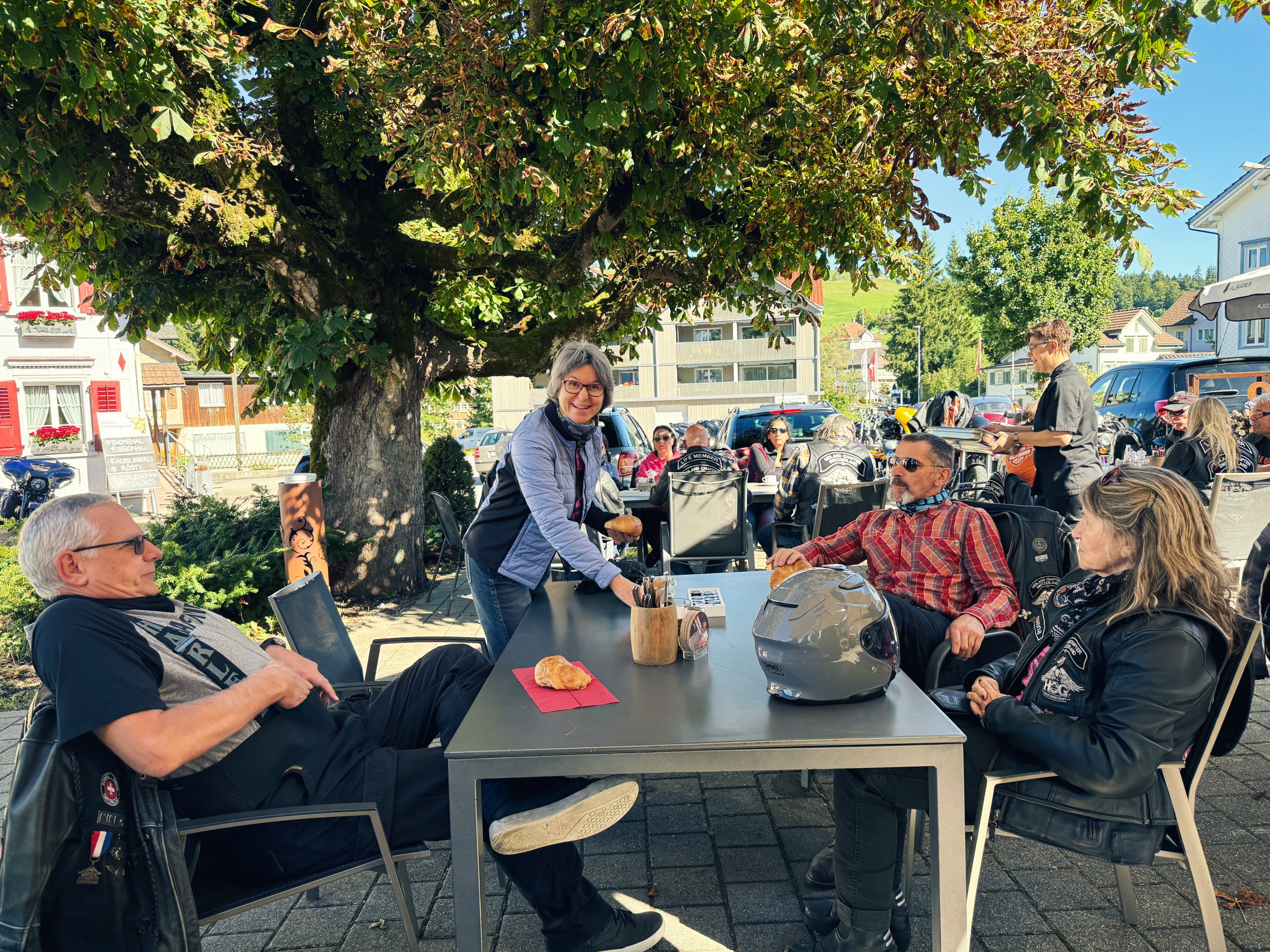 Wieder in der Schweiz kurven wir nun über die Hügel des Appenzellerlands und geniessen beim steten Auf und Ab die wunderbare Landschaft. Beim Kaffeehalt in Schönengrund haben wir im Gartenrestaurant des Ochsens genügend Zeit für eine entspannte Pause. Die Sonne wärmt bereits, und einige sind froh über die schattenspendenden Sonnenschirme. Gut erholt freuen wir uns auf die Weiterfahrt um 11.15 Uhr. RC Mike erklärt, dass die nächsten Kilometer in Richtung Winterthur führen. Über eine weiterhin hügelige Gegend gelangen wir ins Zürcher Oberland und haben auch hier teilweise grandiose Weitblicke auf alle Seiten.