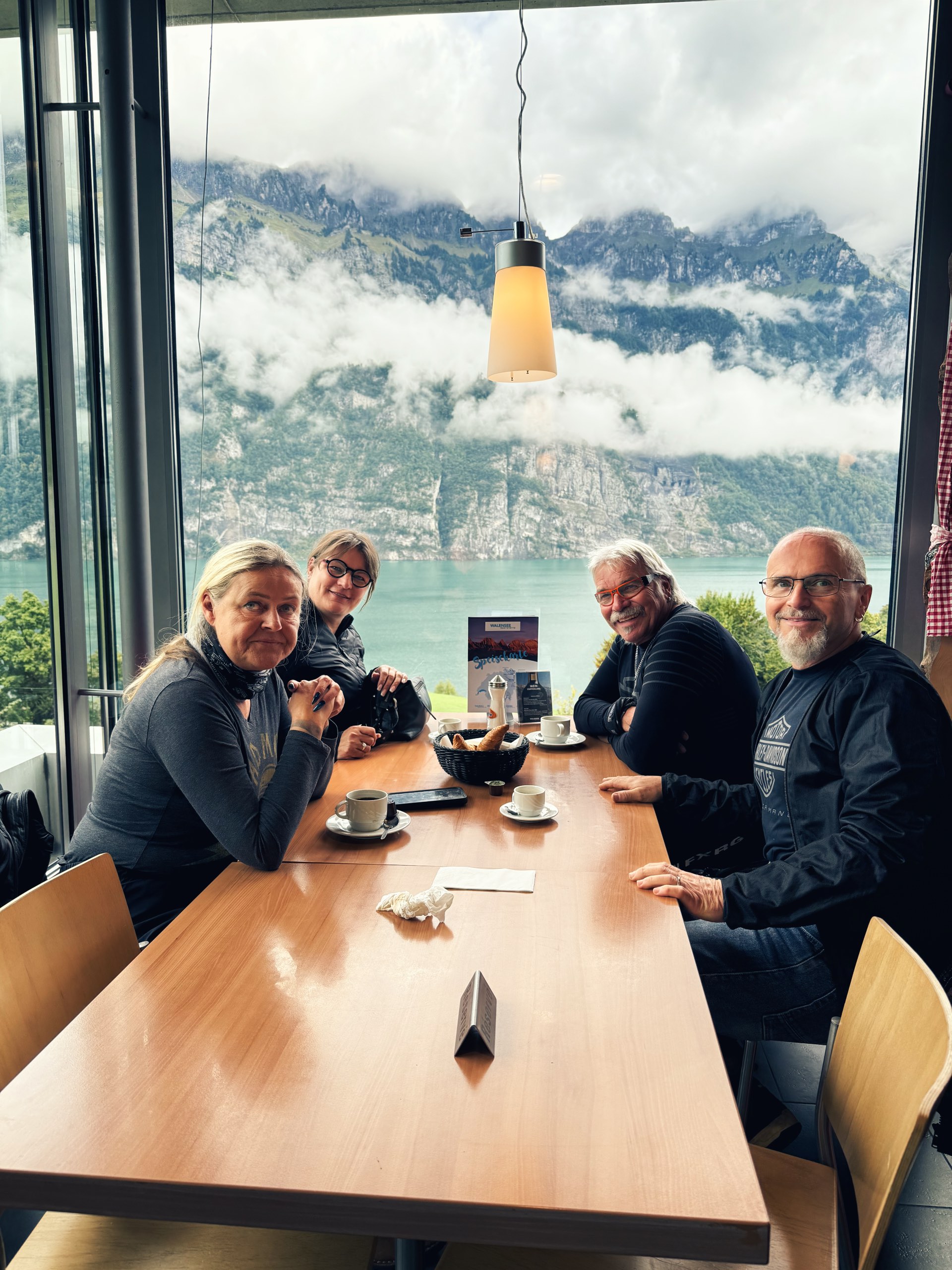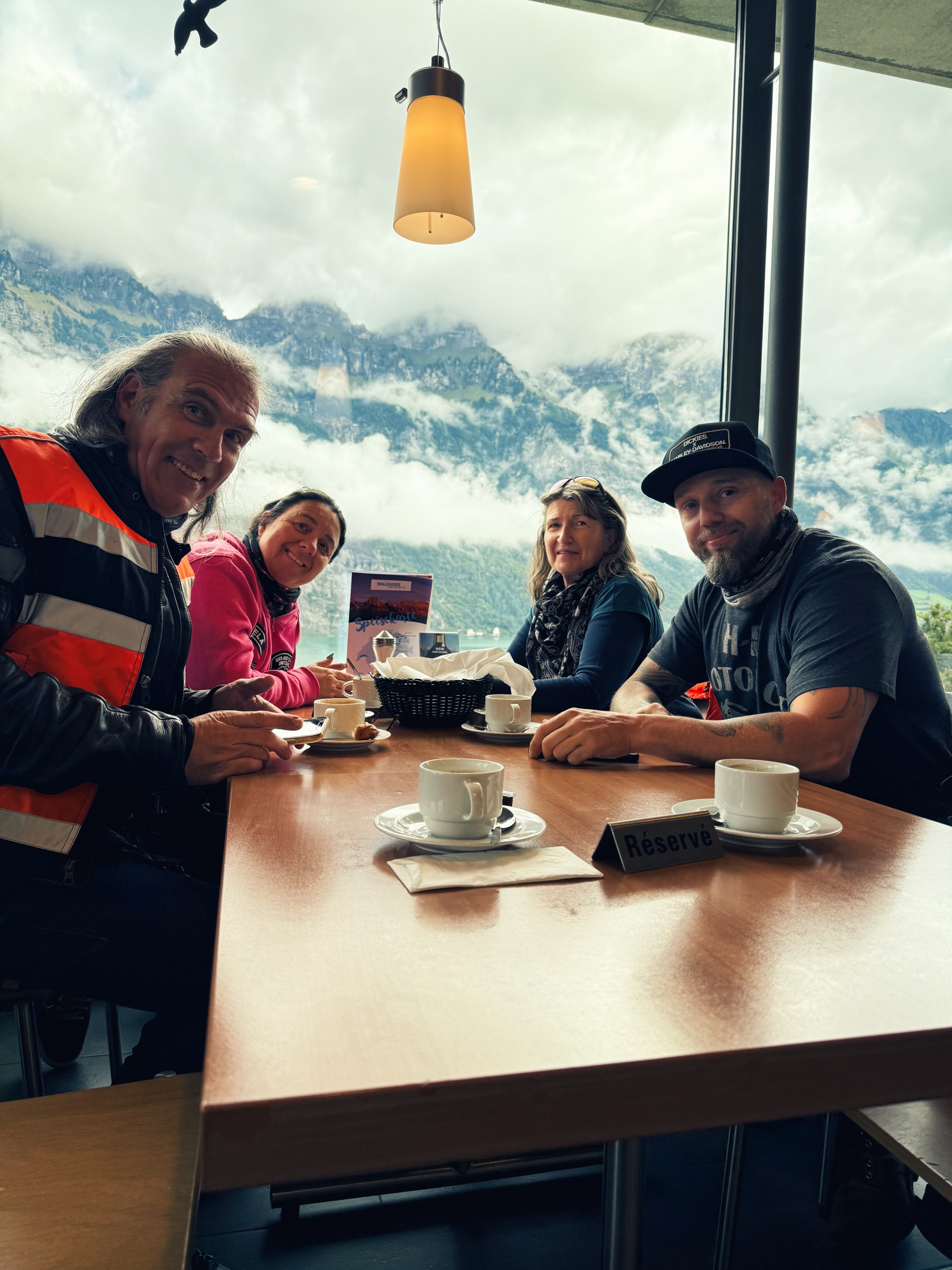 Um 8.20 Uhr starten wir die Maschinen und fahren via Bremgarten und Oberwil-Lieli auf die Autobahn. Bereits auf diesem Streckenabschnitt haben wir Sicht auf die Berge, wenn auch noch etwas wolkenverhangen. Auf der Autobahn geht es zügig voran, das von Mike erwartete vermehrte Verkehrsaufkommen aufgrund des ESAF bleibt aus. Umso besser, denn dadurch erreichen wir leicht verfrüht um 9.45 Uhr die Autobahnraststätte Walensee, wo uns die Chapter-Kasse die vorbestellten Gipfeli und den Kaffee spendiert. Auch hier hätten wir aus den Panoramafenstern einen tollen Blick auf die Churfirsten, aber die Wolken haben sich noch nicht verzogen. Dennoch ist es immer noch trocken – zumindest von oben. Die Regenkleidung behalten wir vorsichtshalber noch an, sie hält ja auch den Wind ab.