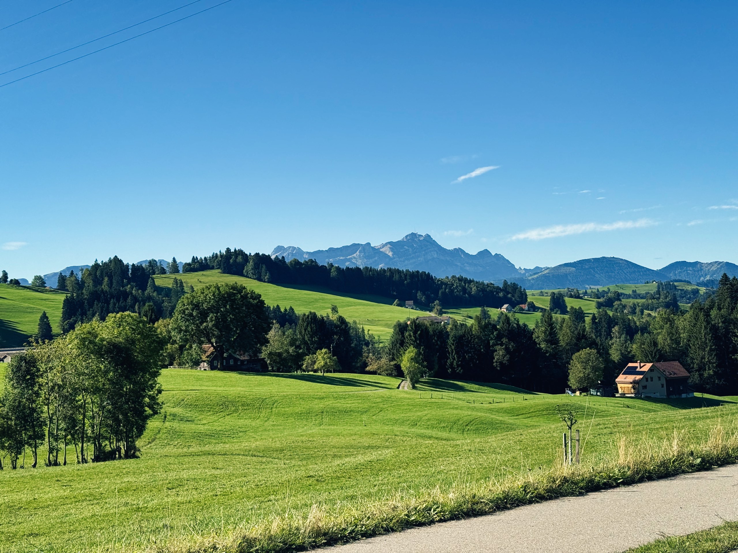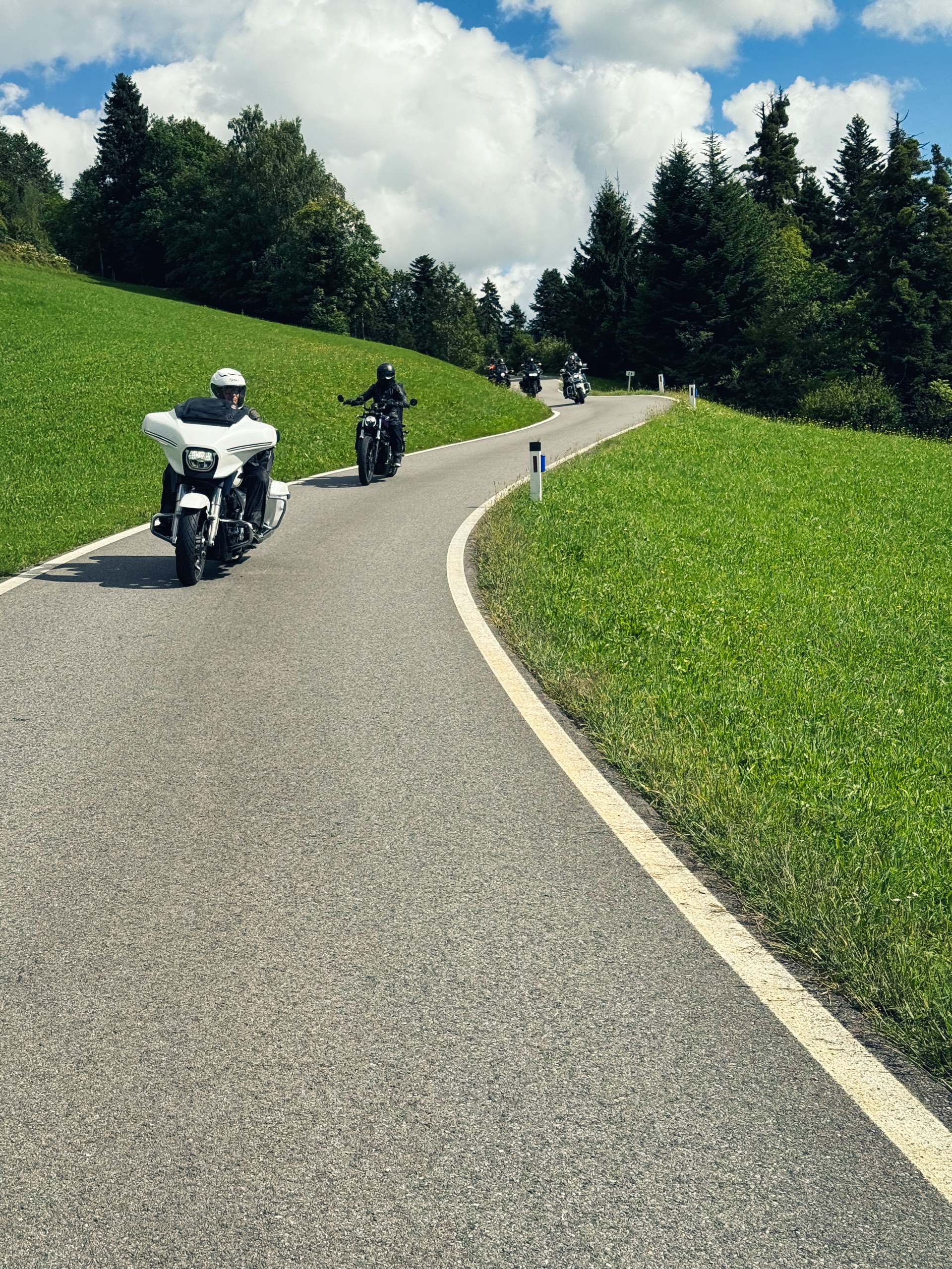 Nachdem wir uns am reichhaltigen Frühstücksbuffet verpflegt haben, sind alle pünktlich bei ihren Harleys bereit zur Abfahrt. Nach dem Briefing brausen wir kurz vor 9 Uhr in geordneter Formation wieder los. In der Ferne sind bereits die Bergketten des Alpsteins sichtbar, die Umrisse sind gestochen scharf. Das Wetter ist heute absolut genial und erfreut unsere Biker-Herzen.
